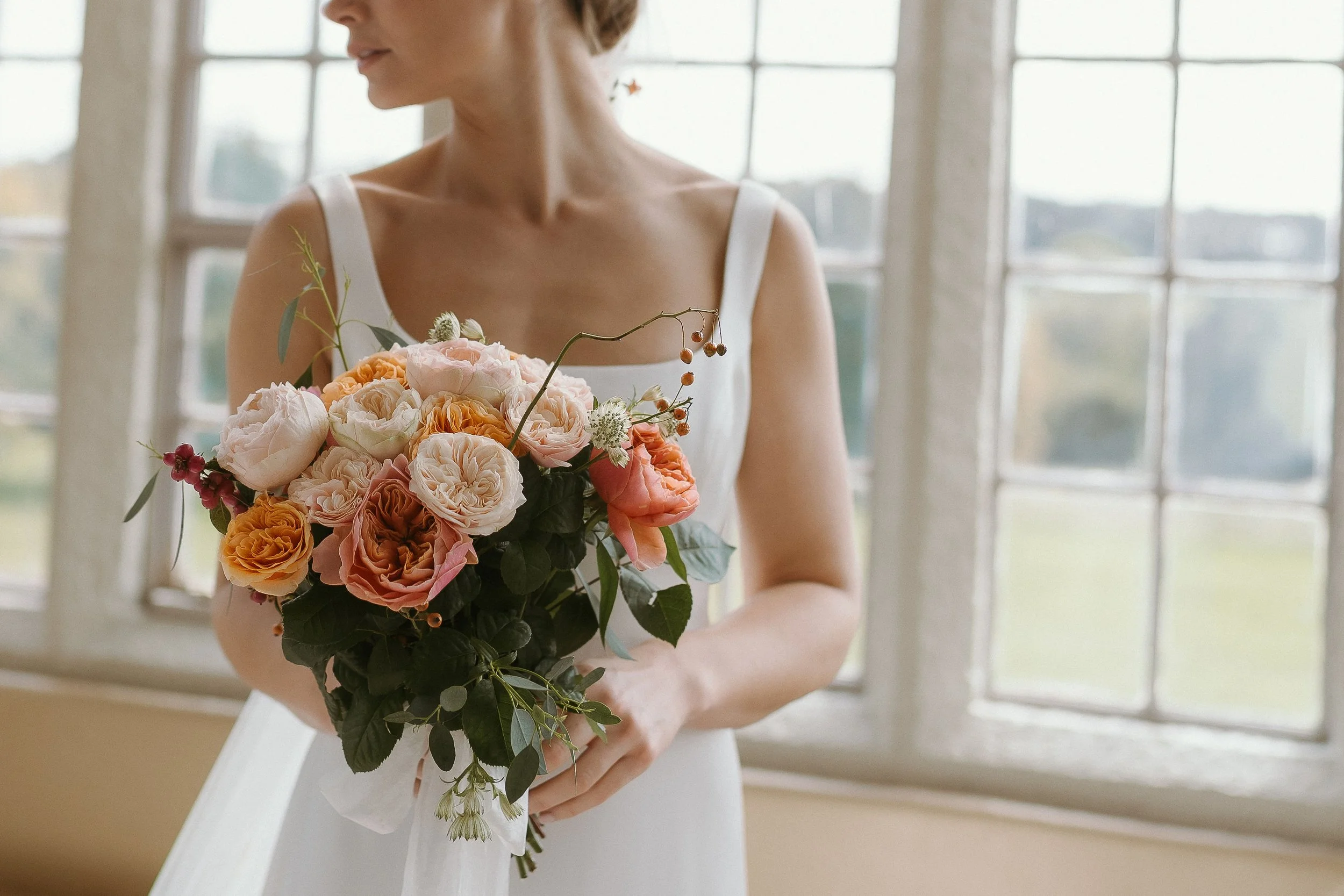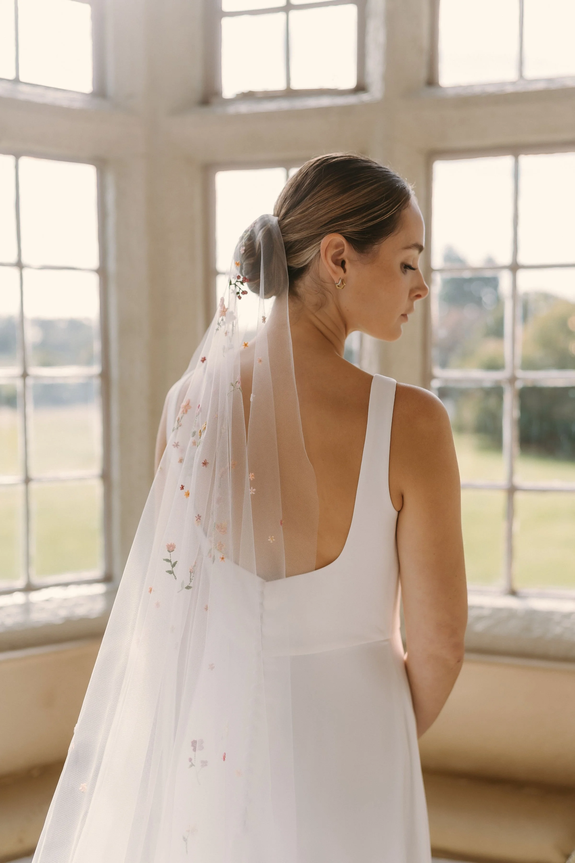 Subtle embroidery, delicate motifs, or soft hints of colour can reflect the surroundings without becoming overly literal. These quieter details often reveal themselves slowly and are all the more beautiful for it. You can reflect your wedding setting in small embroidered details on your veil or dress, or in the flowers you select with your florist.